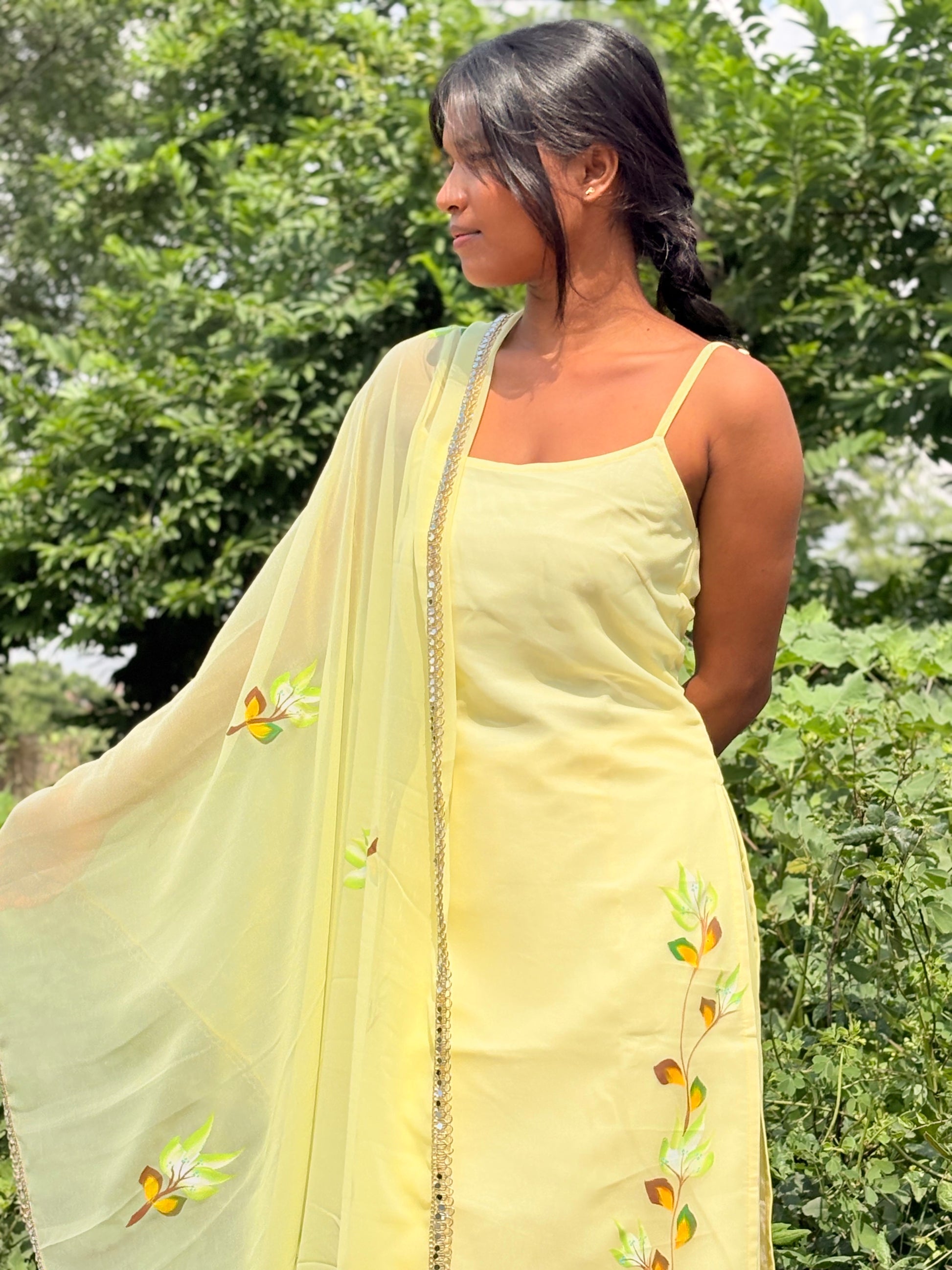 Inspired by the timeless romance of Mohabbatein, this hand brush-painted suit set is a celebration of love, art, and filmi elegance. Each motif is carefully painted by hand, making every set a unique masterpiece that captures the delicate charm of classic Bollywood romance.