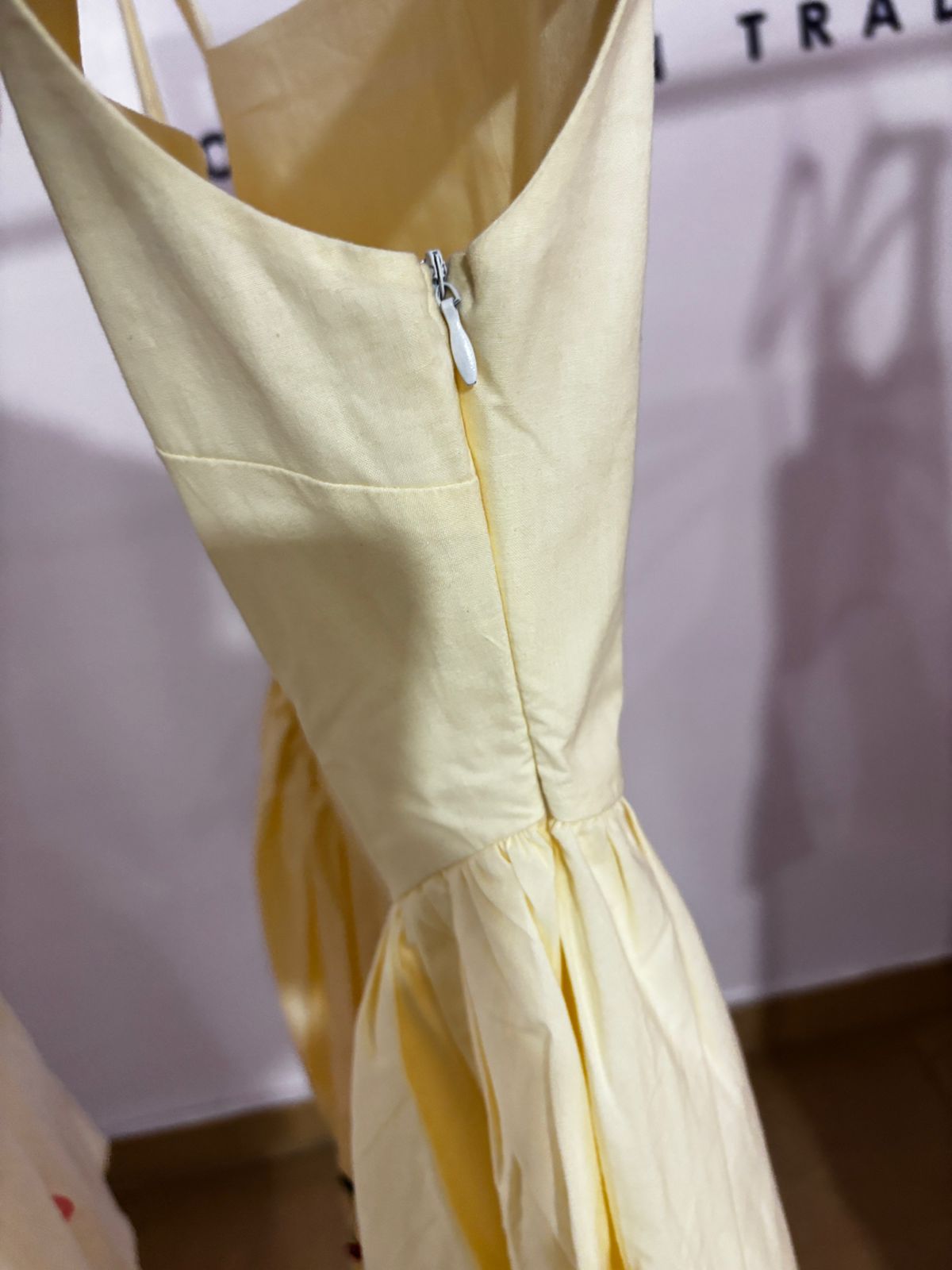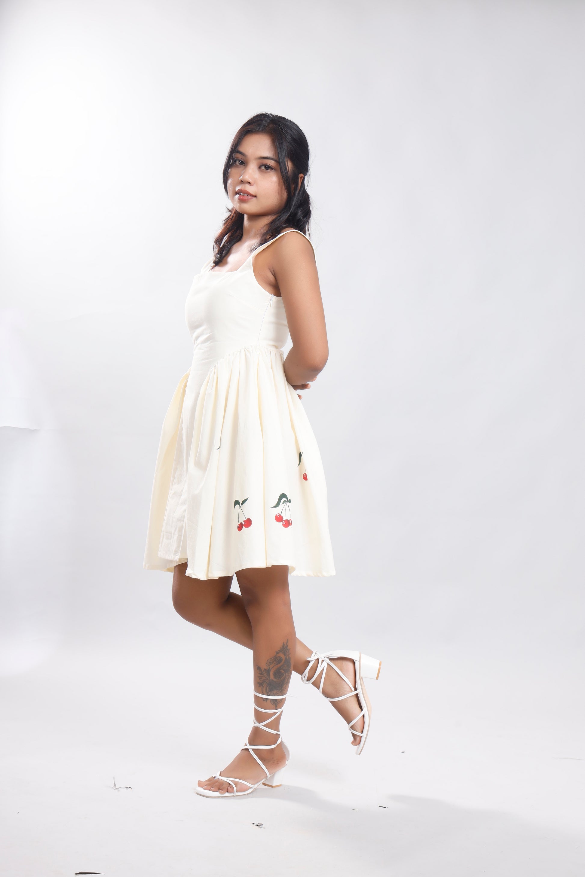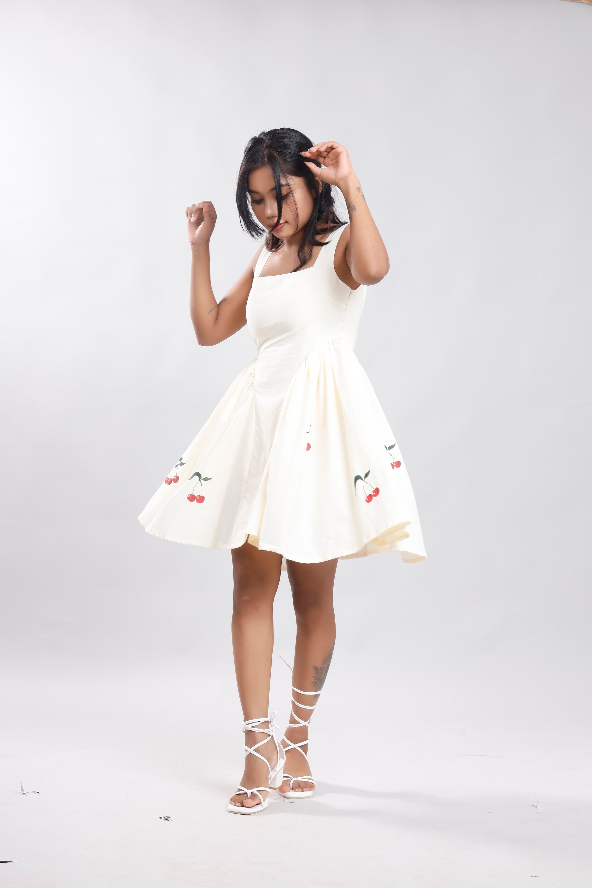 Celebrate artistry in fashion with this exquisite hand-painted dress, featuring vibrant cherry motifs that symbolize joy and freshness. Each brushstroke is carefully crafted by skilled artisans, turning the fabric into a living canvas.